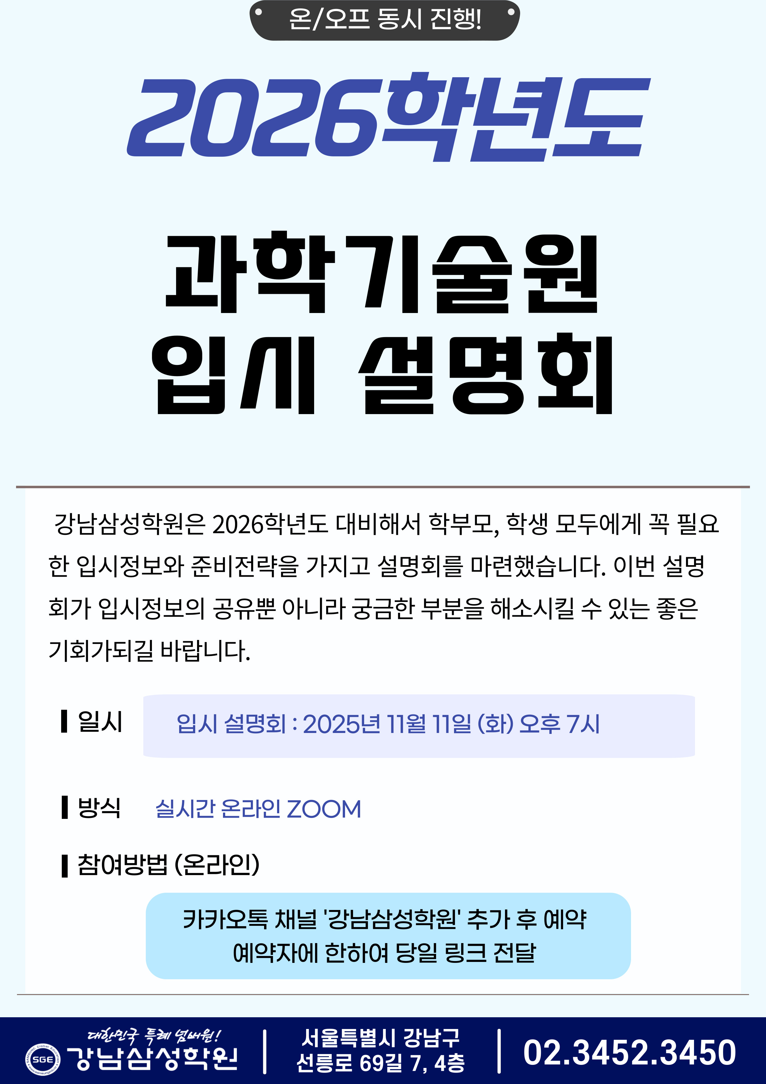 [설명회/간담회] 2026학년도 대비 과학기술원 입시설명회 강남삼성학원 0 4 10.24 19:40 https://samsungedu.kr/sge/bbs/board.php?bo_table=seminar&wr_id=963 + 1 https://samsungedu.kr/sge/rss/rss.php + 1